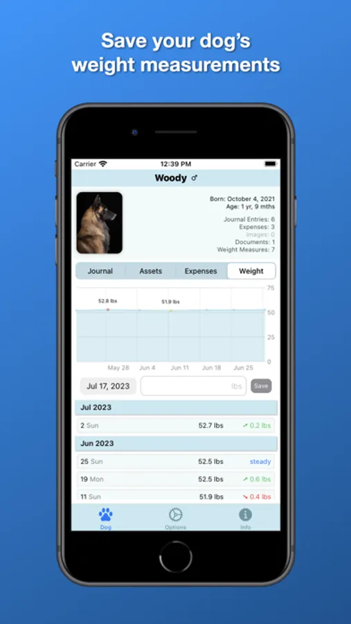 ・Weight: Keep a record of your dog's weight measures, which is especially valuable when your dog is growing up.