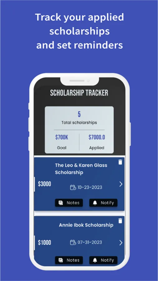 Deadline and Application Tracking: Stay on top of your scholarship applications with our dashboard. Monitor deadlines and keep track of your application statuses all in one place.