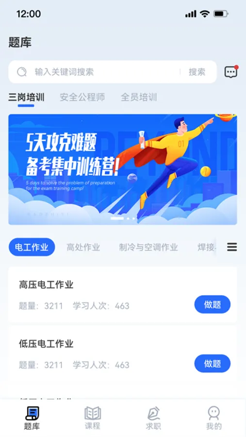 内容涵盖特种作业上岗证,职业技能等级,职业资格考前辅导,行业企业等各类专业课程,海量试题,全面助力学员考证上岸。