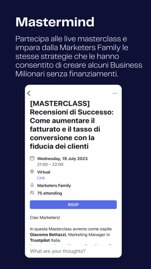 3 - Mastermind. Partecipa alle live masterclass e impara dalla Marketers Family le stesse strategie che le hanno consentito di creare alcuni Business Milionari senza finanziamenti.