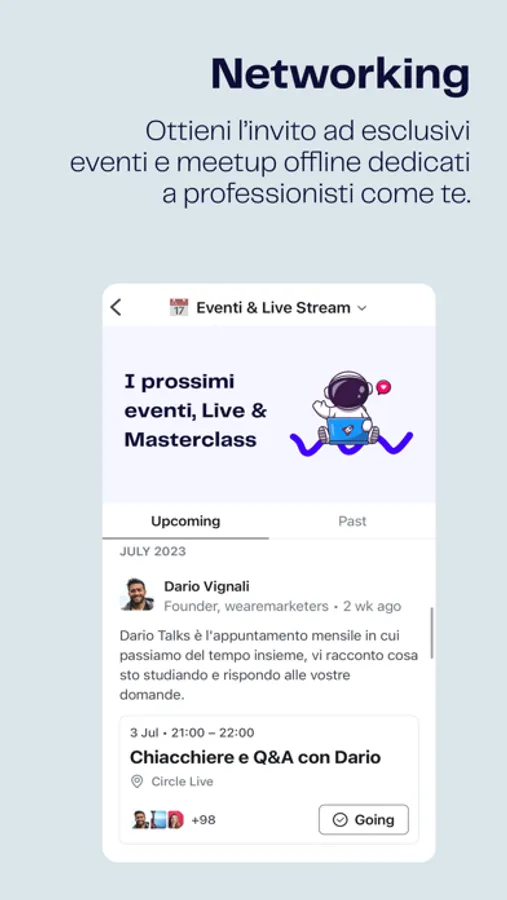 2 - Networking. Ottieni l’invito ad esclusivi eventi e meetup offline dedicati a professionisti come te. Non ti perdere l’opportunità di divertirti mentre conosci nuovi amici o collaboratori.