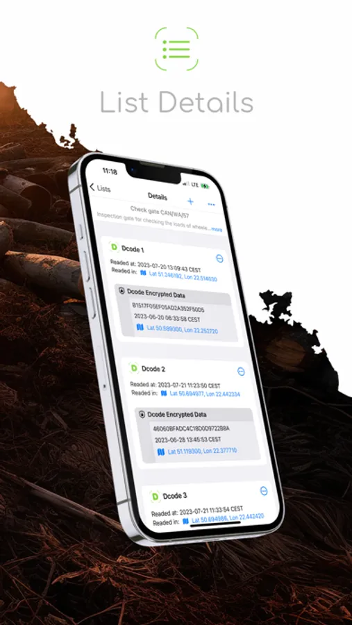 Dcode is an encrypted variable code mark, indented on a timber ring at the forest and is delivering a geo-localization accuracy on a 2m level, timestamp accuracy to a one second level.