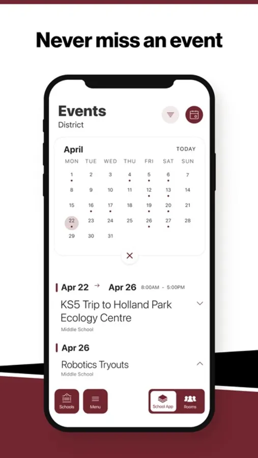 The event section shows a list of events throughout the district. Users can add an event to their calendar to share the event with friends and family with one tap.