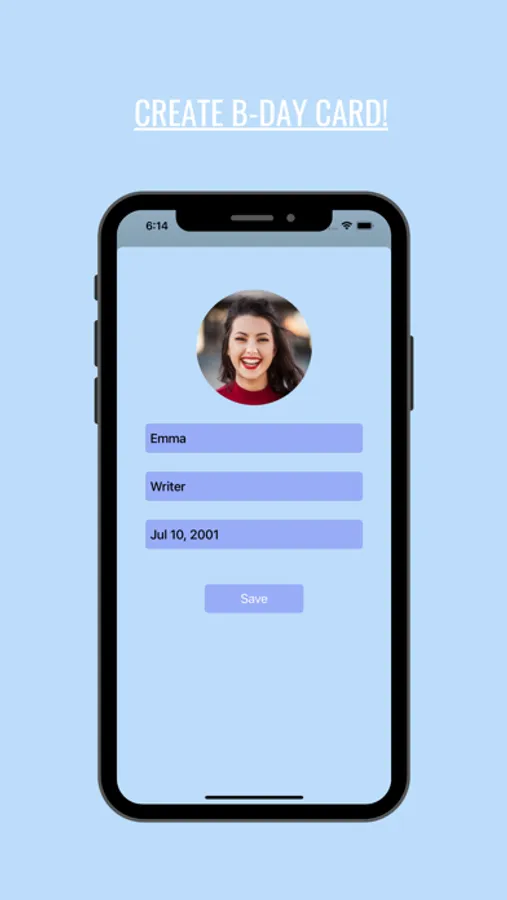 Contact cards show the birthdays and remaining days of the people you add. To create a contact card, add a person whose birthday is tomorrow. Do not forget to fill in the requested information, otherwise you will receive a warning. After saving, you will be taken to the main screen.