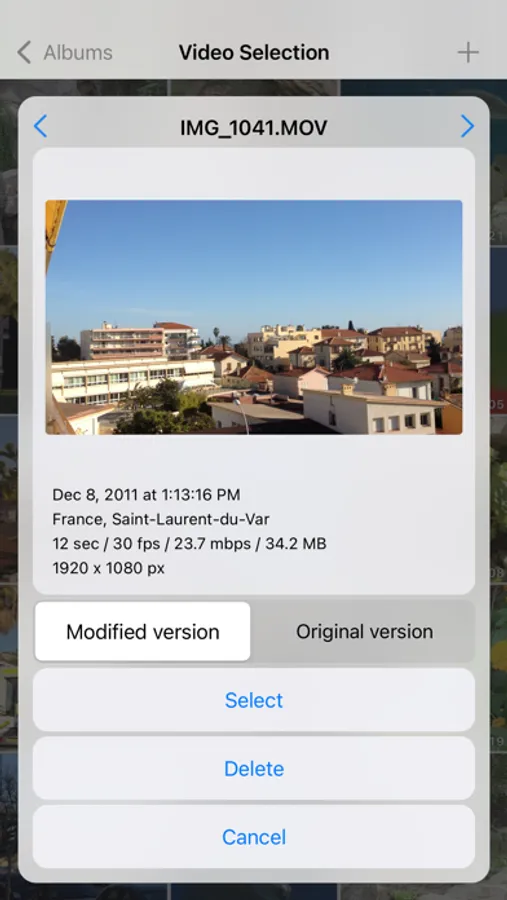 • Preview the video during selection (with information like date, size, duration, GPS location).