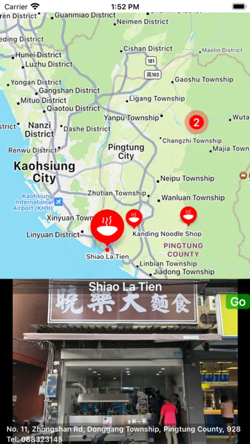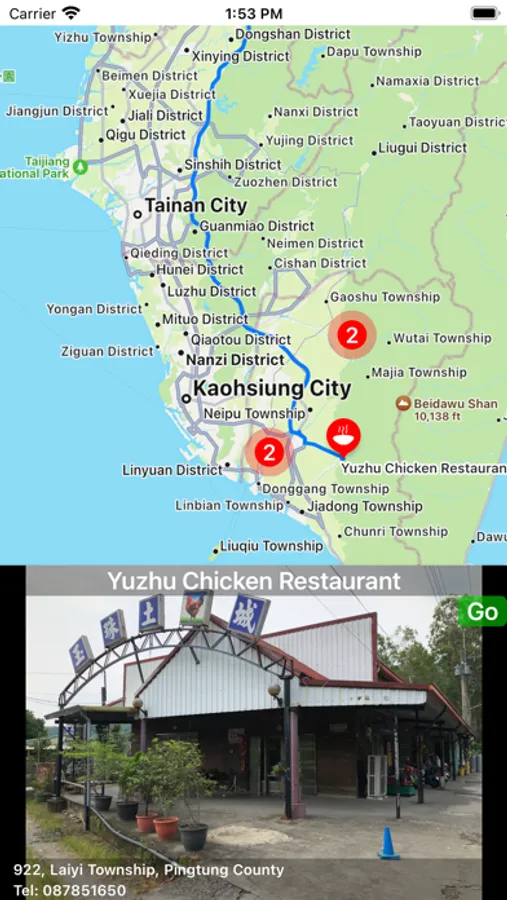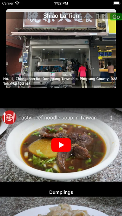 Maptastes shows a map of restaurants and food stalls in Taiwan. Clicking on a marker on the map displays a page that gives more information about the location. Swiping the page up displays pictures of the dishes and a YouTube video showing the Maptastes team reviewing the food. Clicking the green "Go" button in the top right corner of a restaurant's picture automatically links to the iOS navigation system giving driving or transit directions to the restaurant. This feature requires giving the app permission to use your location. Moreover, the navigation system will work only while you are in Taiwan, otherwise a route to the destination will not be found. In the near future, more locations will be added to the map without updating the app.