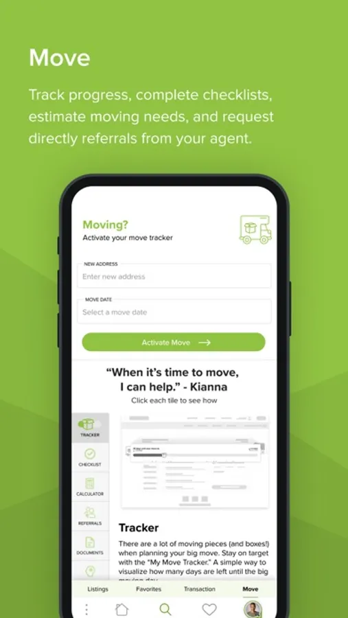 My Move: View move progress, estimate moving needs, complete checklists, and receive service referrals or second opinions from your agent.