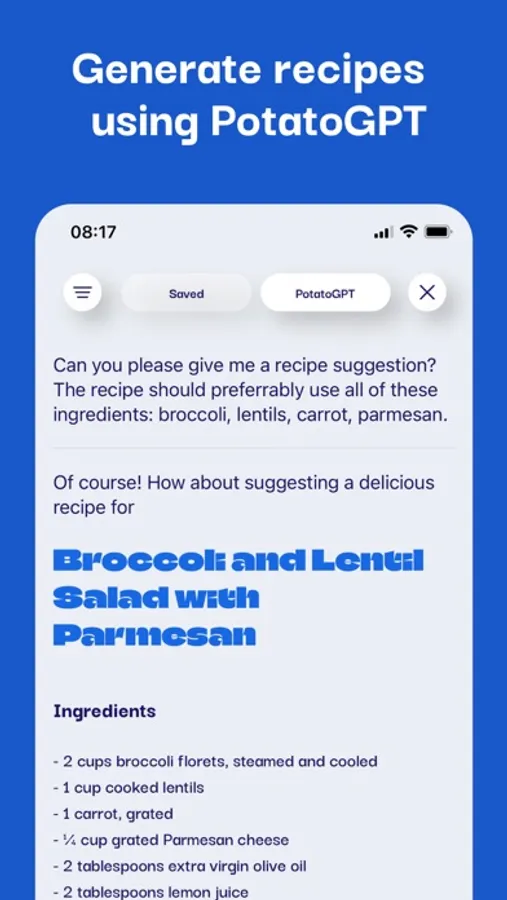 Need inspiration for your next recipe? Don't want to throw away ingredients that are too good to go but you don't know what to make with them? Let the AI powered PotatoGPT work its magic and generate up to 100 AI recipes per month using the ingredients you already have. AI recipes generated by PotatoGPT take into account your diet and preferred cuisine. Seamlessly meal plan AI recipes.