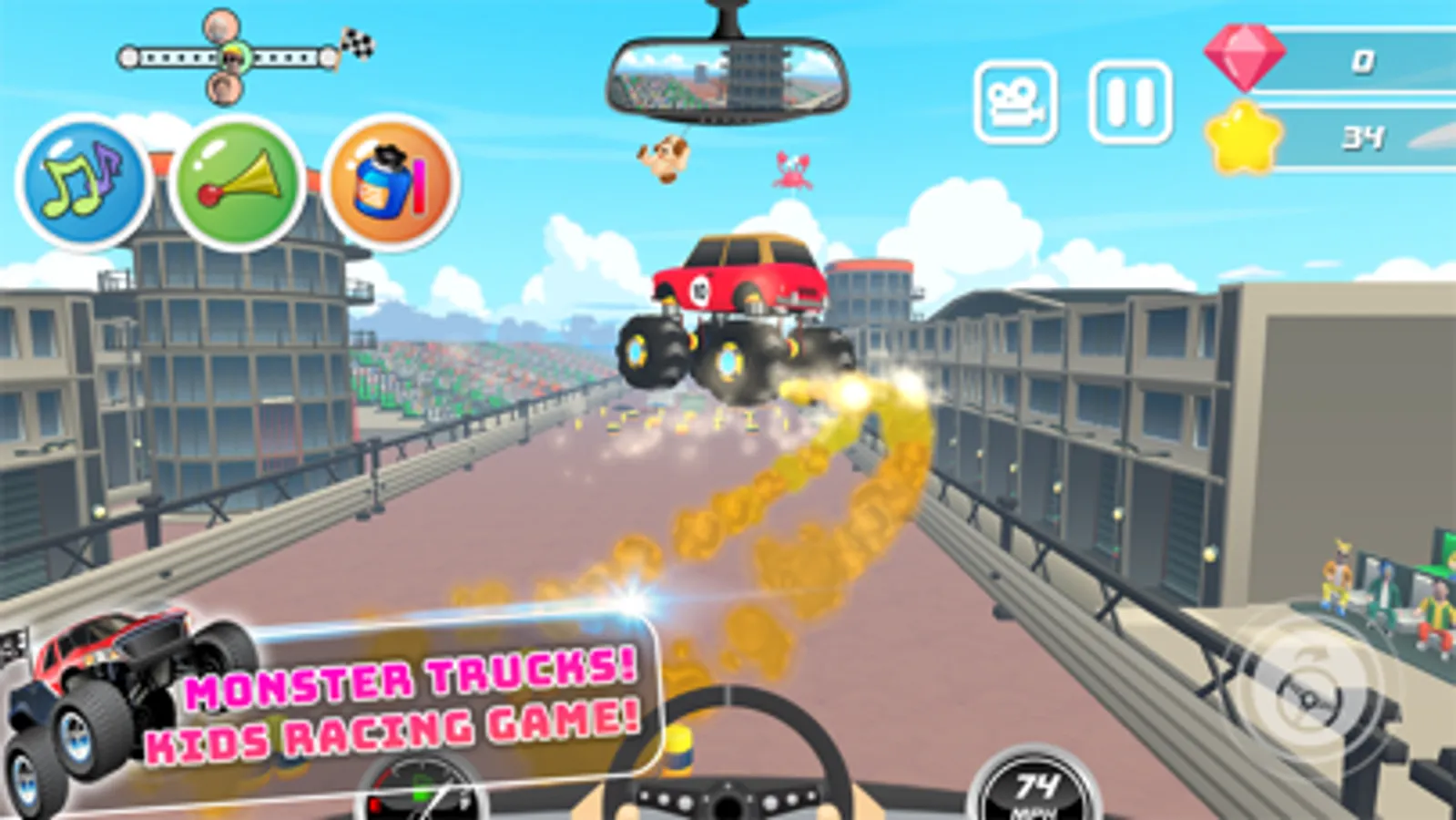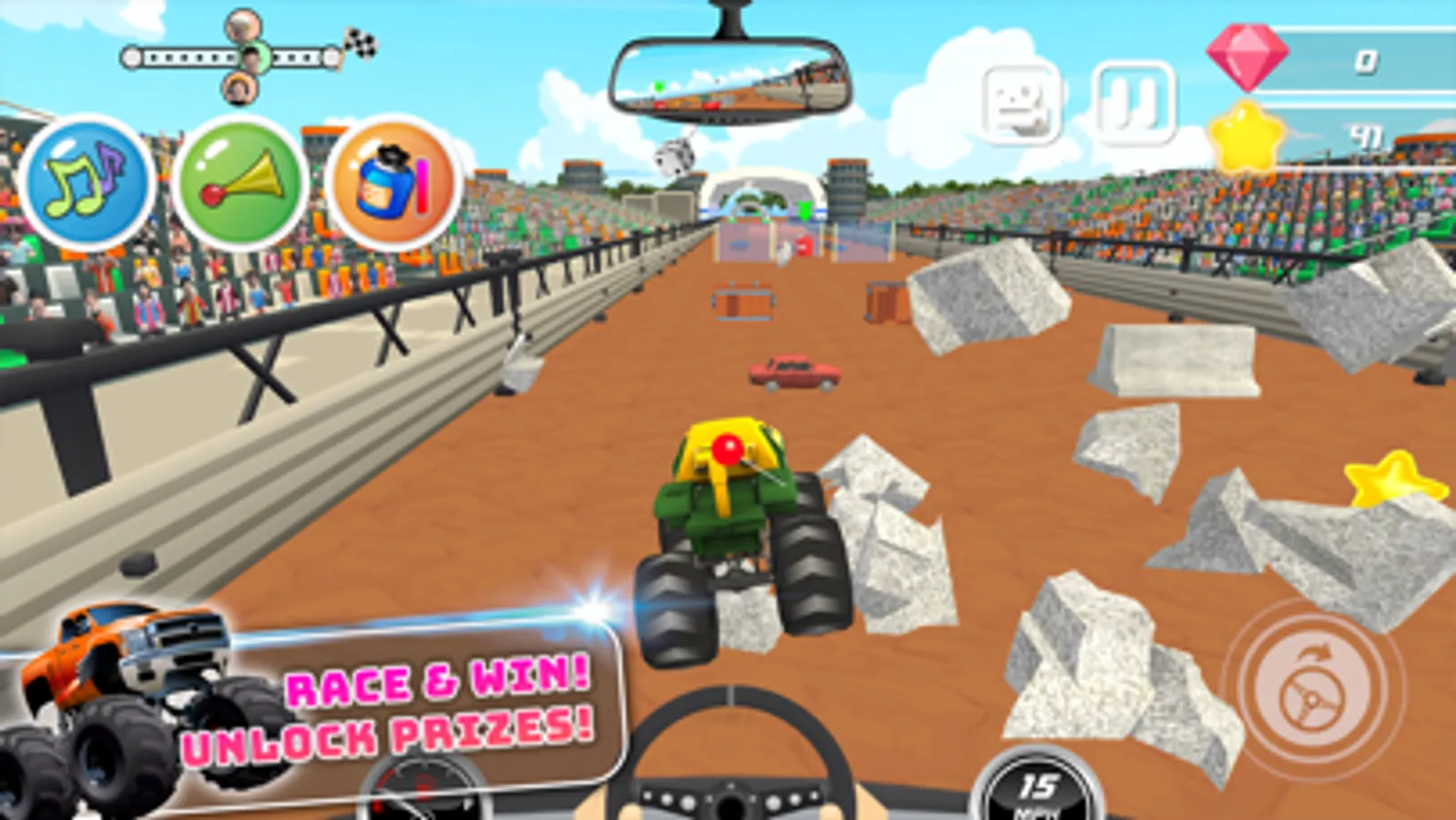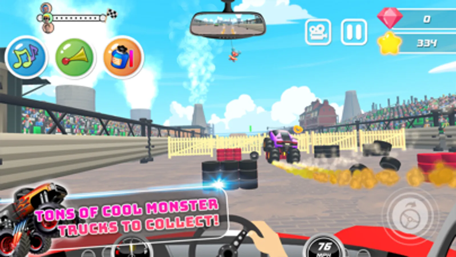 Fun colorful buttons to Beep the horn and change the music track or activate the nitro to speed up ahead of the other cars. Unlock new antennas, wheels, accessories and drivers to blaze your monster truck along the course.