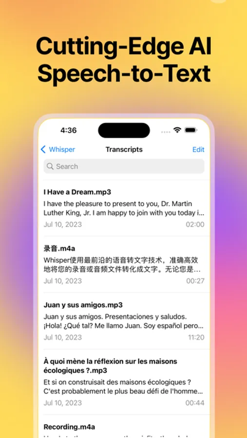 Whisper redefines your transcription experience, making it as seamless and efficient as possible. Whether you need a transcript of a meeting, a lecture, or any other critical audio, our app is designed to cater to all your needs.