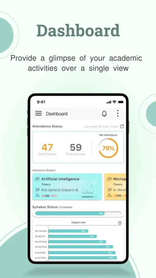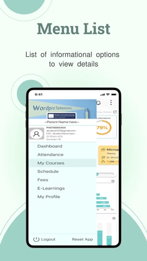 b) Course-wise/Subject-wise attendance: Parents can view total attendance for each subject in the current semester. Clicking on a subject reveals day-wise attendance with the respective teaching faculty's name and profile.
