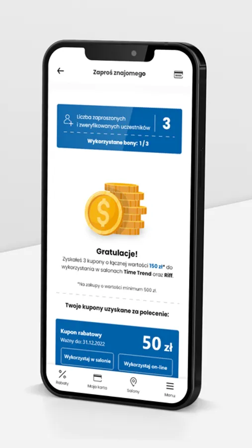 6/ oferuje kupony rabatowe o wartości 50 zł za skuteczne polecenie aplikacji. Każdy Uczestnik może zaprosić do trzech znajomych. W momencie gdy zaproszona osoba zarejestruje się programie lojalnościowym Time to Riff, polecający otrzyma kupon rabatowy o wartości 50 zł na kolejne zakupy o wartości minimum 500 zł.