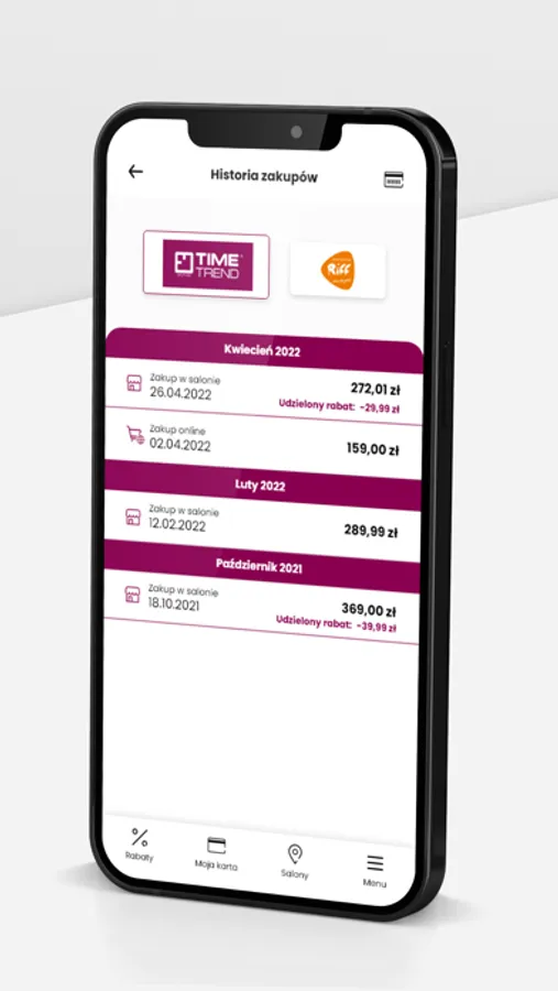 Time to Riff to program lojalnościowy sieci salonów Time Trend oraz Salonów Muzycznych Riff oferujący atrakcyjne rabaty oraz starannie wyselekcjonowane zestawy przywilejów dostępne wyłącznie dla zarejestrowanych Uczestników, dokonujących zakupów w stacjonarnych punktach sprzedaży Time Trend lub Riff.