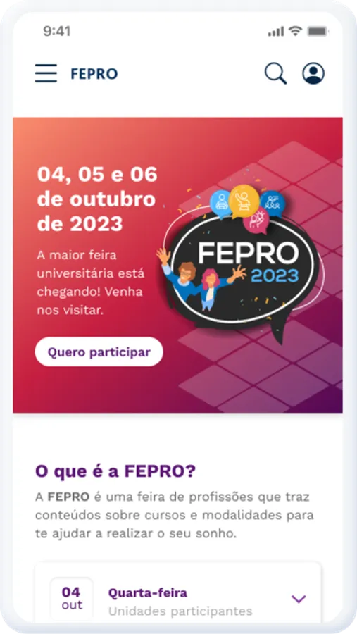Descubra um mundo de oportunidades na FEPRO da Cruzeiro do Sul Educacional! Nosso aplicativo é seu guia completo para explorar todo o evento, com conteúdos sobre palestras, parceiros, cursos e universidades , além de obter informações sobre carreiras. Navegue pela agenda, faça check-in na feira, obtenha suporte e compartilhe sua experiência.