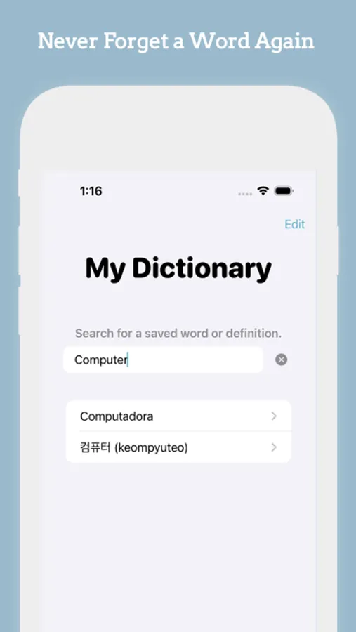 SMART DICTIONARY SEARCH: Lexipedia allows you to search within your personal dictionary by the word itself or its definition. This makes it easy to find words you've previously looked up, even if you only remember the meaning and not the word itself.