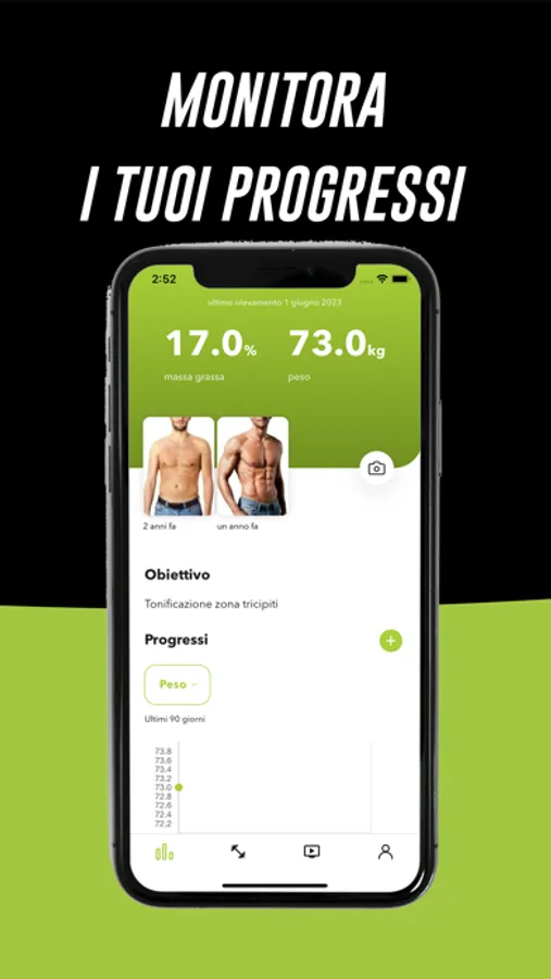 Avrai sempre sotto controllo la tua attività fisica: potrai visualizzare quali esercizi sono previsti nel tuo piano di allenamento, i tuoi progressi e come cambia il tuo fisico nel corso del tempo.