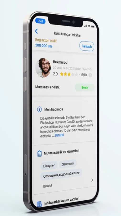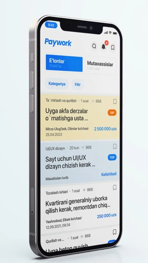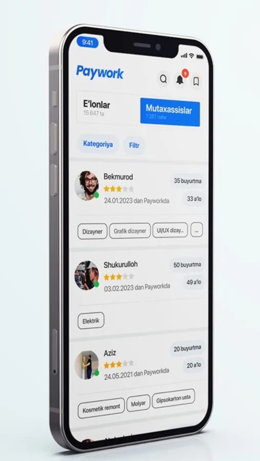 Paywork - Ish va ishchi topish uchun mo‘ljallangan ilova. Mazkur ilova har qanday shaxs bir kunlik yumushlari, vazifalariga masofadan turib mutaxassislarni jalb qilishi va mutaxassislar esa uyidan chiqmagan holda buyurtmalarni qabul qilishi uchun mo`ljallangan.