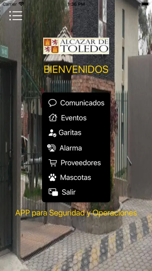App para manejo de Operaciones y Seguridad en Conjuntos Habitacionales o Edificios con pantallas de Comunicados Oficiales y registro de alícuotas o pagos por parte de Administración, Programación de Eventos con reserva de Areas Comunales, Información de Novedades de Garitas de Ingreso, Alarma Comunitaria y Emergencia Medica, Información de Proveedores con identificaciones para proveedores autorizados, Información de Mascotas de Propietarios de las casas, Generación de Invitaciones a Eventos y Generación de Credenciales para Proveedores y Mascotas con códigos QR , personalizado para cada Conjunto, esta version es para el Conjunto Alcazar de Toledo, entonces sirve para los usuarios de este Conjunto Habitacional
