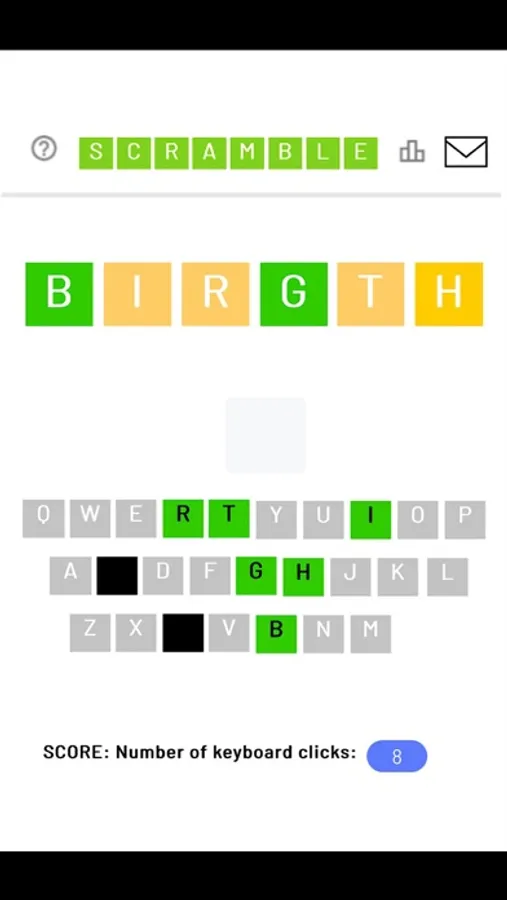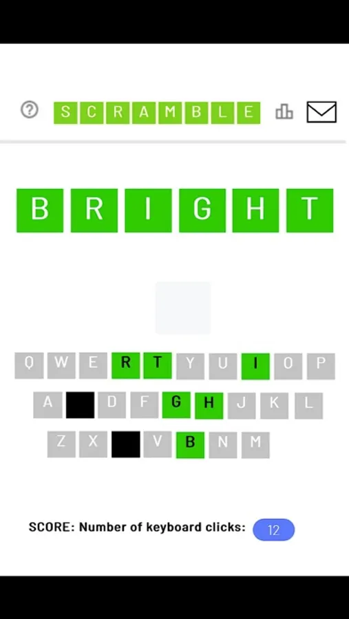 - Goal is to solve the Scramble with the fewest number of keyboard clicks. Best possible score is 6 keyboard clicks -- no incorrect letters guessed and all 6 correct letters placed in their proper positions.