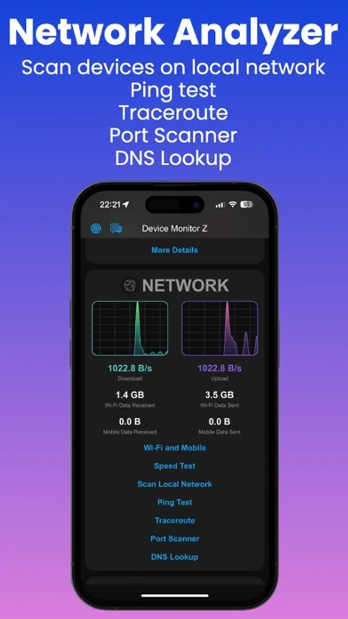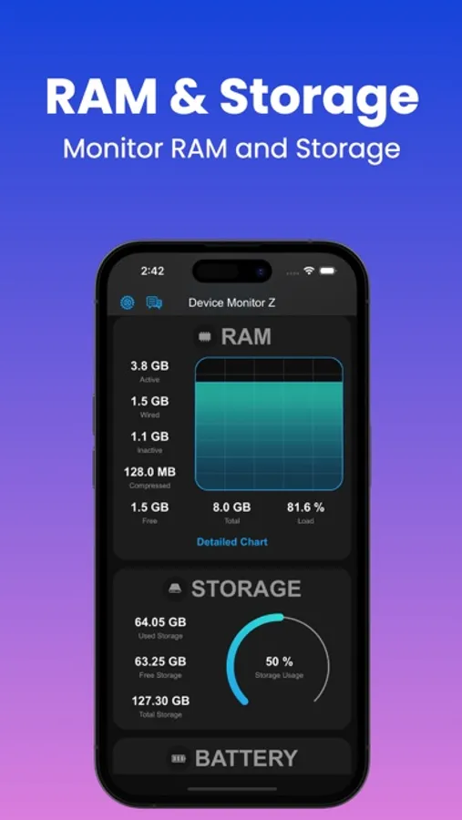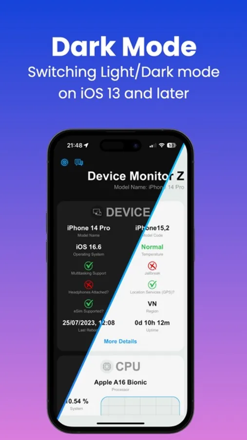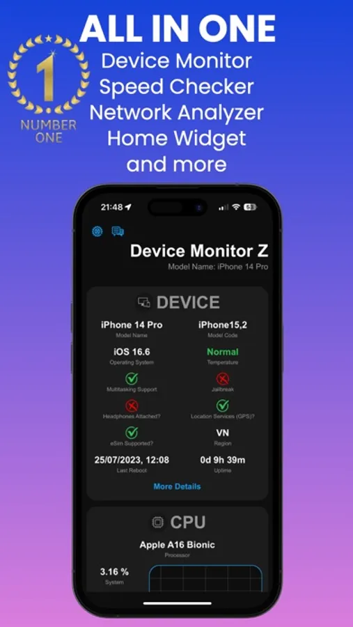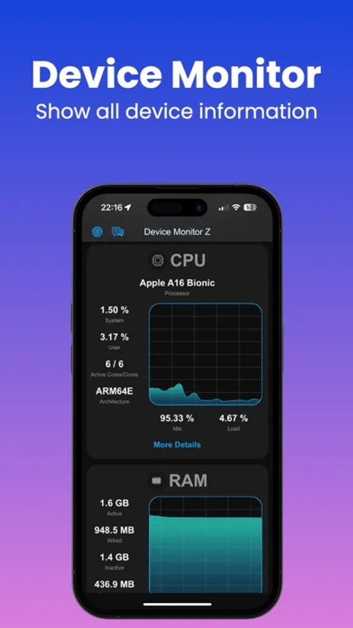 Discover the power of our app - Device Monitor Z (also known as iDevice Monitor) is an app optimized for iPhone, iPod Touch, and iPad users. It provides a quick and efficient way to access activity monitor (CPU monitor, detailed RAM, Storage space, ...) and system information of device.