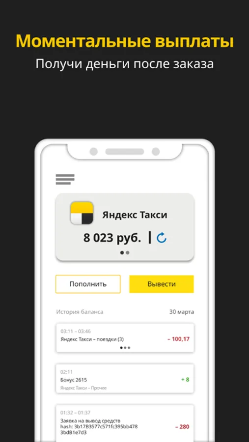 Таксопарк Style PRO ежедневно создает комфортные условия для водителей такси и курьеров. Наше приложение для водителей Яндекс.Такси, Uber такси и курьеров обеспечивает удобный вывод денежных средств на карту моментально, без запроса менеджеру Яндекс ПРО и ожидания расчётного периода в любой день недели. Скачиваете приложение, регистрируетесь в Яндекс.ПРО и выводите денежные средства уже после первого заказа. Денежные средства поступят на счёт или карту моментально.