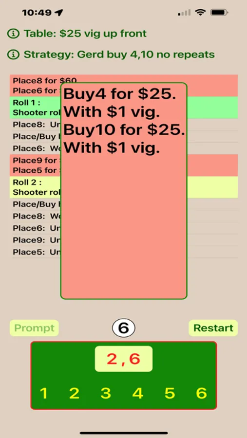 "Prompt" allows you to apply one of those strategies in real time as you play on-line, at a machine, or at a table. It prompts you how to bet at each roll of the dice according to the strategy.