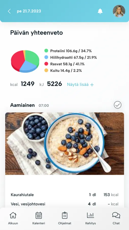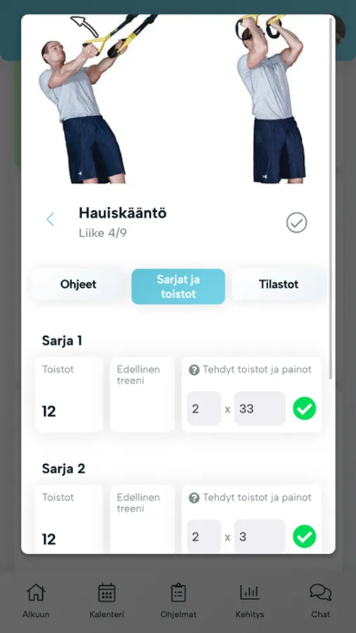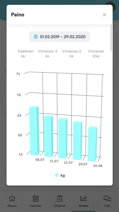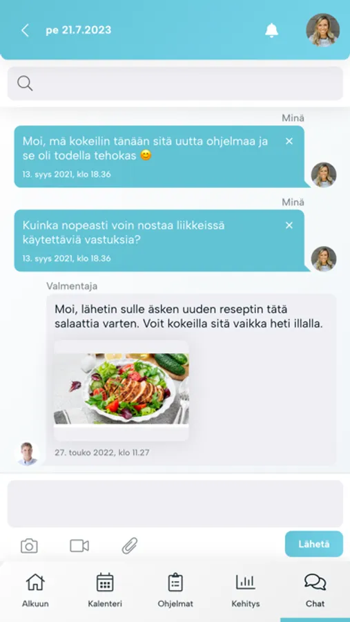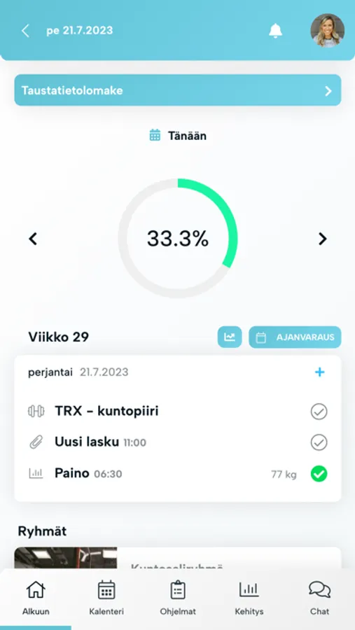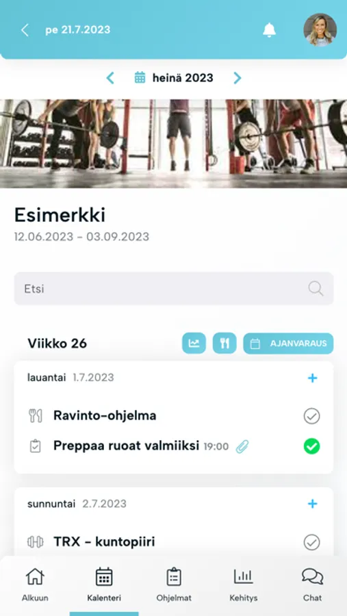 Näe hyvinvointiohjelmasi (ravinto, kuntosali ym.) reaaliajassa ja seuraa kehitystäsi kokonaisvaltaisesti valmentajan kanssa.