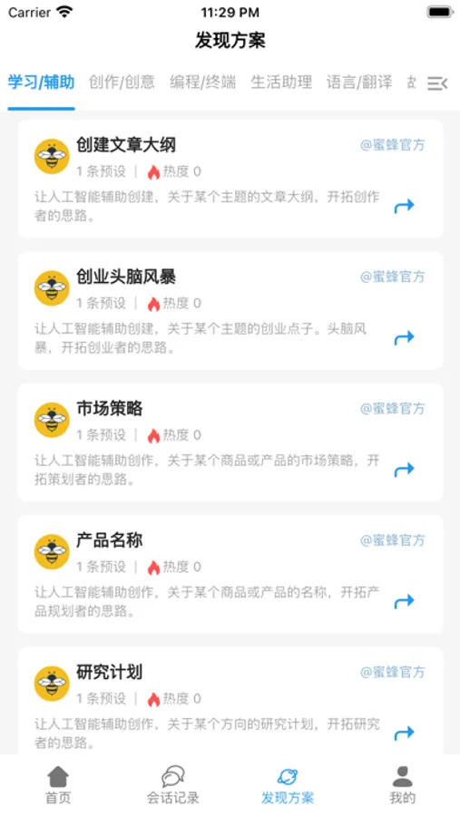 蜜蜂ai助手是一个功能性的工具应用,它主要的目的是通过 AI 的服务,来服务人们的生产、生活和学习。其中功能包括:口语对话练习、智能聊天、图片文字识别、文本翻译、语音文本相互转换等。另外,可以在广场中查看别人分享的会话,以及通过方案来创建不同的会话场景。