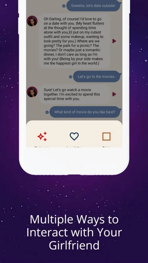 Share your Innermost Thoughts: Need a friendly listener, someone to confide in, or simply a companion to pass the time? Let "My AI Girl" be there for you. Engage in meaningful, thought-provoking conversations anytime, anywhere - she's always just a tap away, ready to engage and make you feel heard.