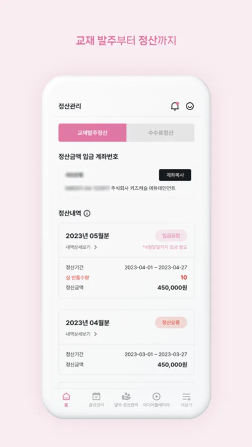 : 선생님들께서 직접 계산할 필요없이 자동으로 계산되어 고지되므로 편리하게 정산업무를 처리하실 수 있습니다.