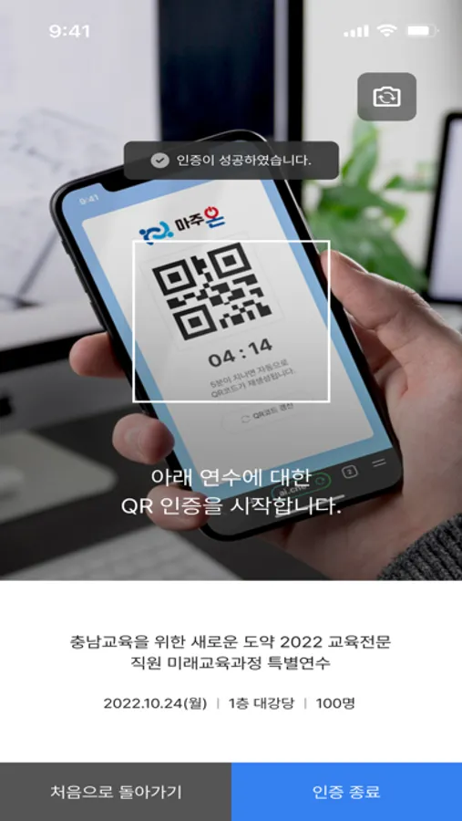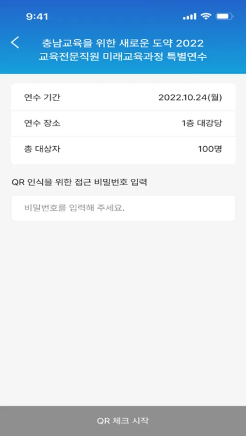 충남교육청 연수 참석자 출석 관리용 전자출입명부 앱입니다.