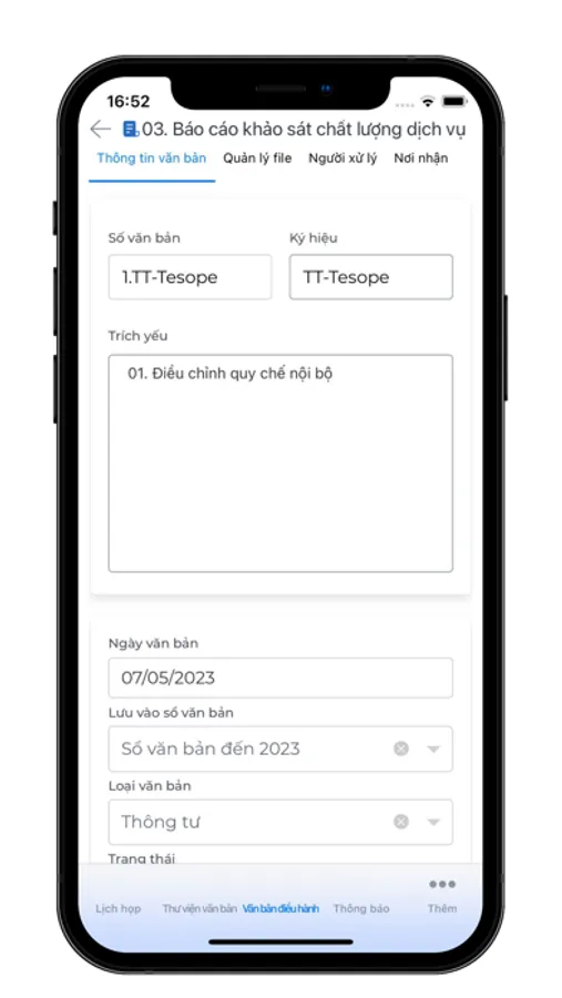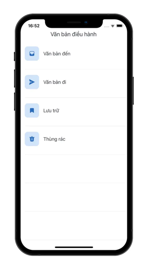 Quản lý văn bản điều hành: Dễ dàng quản lý và truy cập vào các văn bản điều hành của đơn vị. Tìm kiếm, xem và theo dõi luồng, tiến độ xử lý các văn bản một cách thuận tiện từ thiết bị di động.
