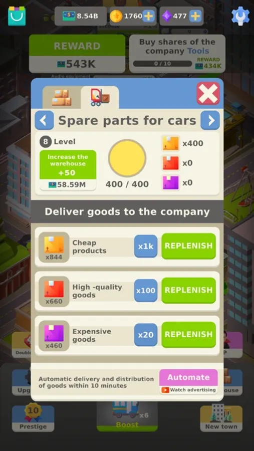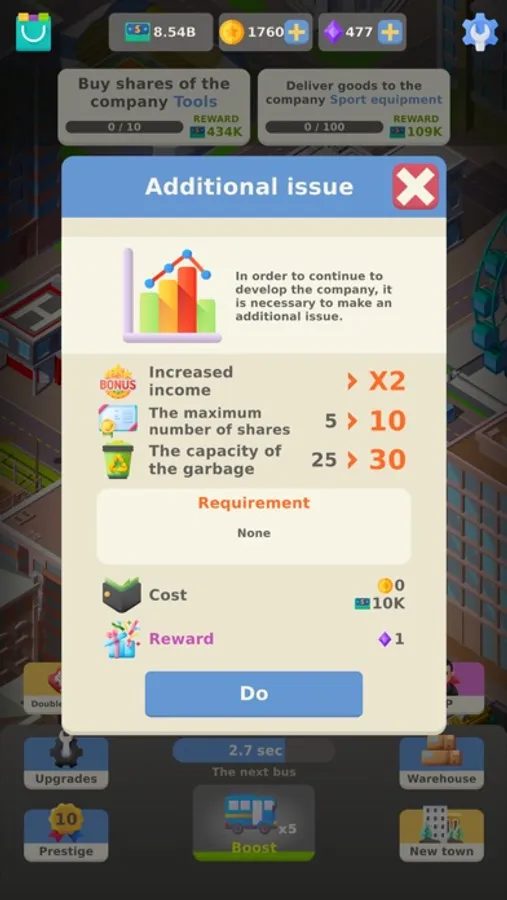 Also in this business simulator, you can issue shares of your enterprises to receive even more income. Yes, like in an investing game!