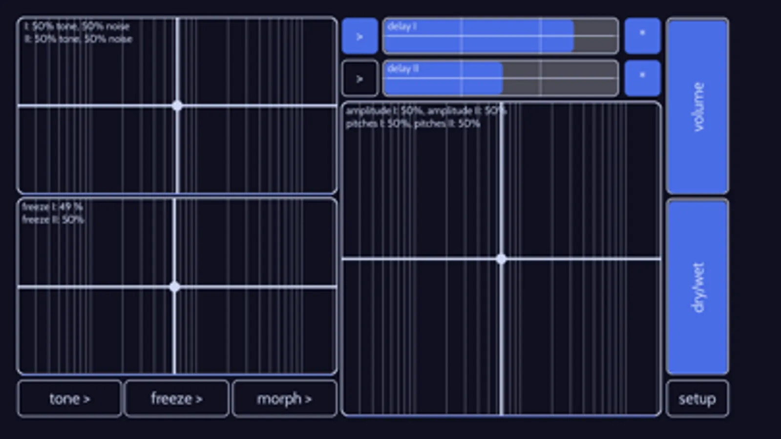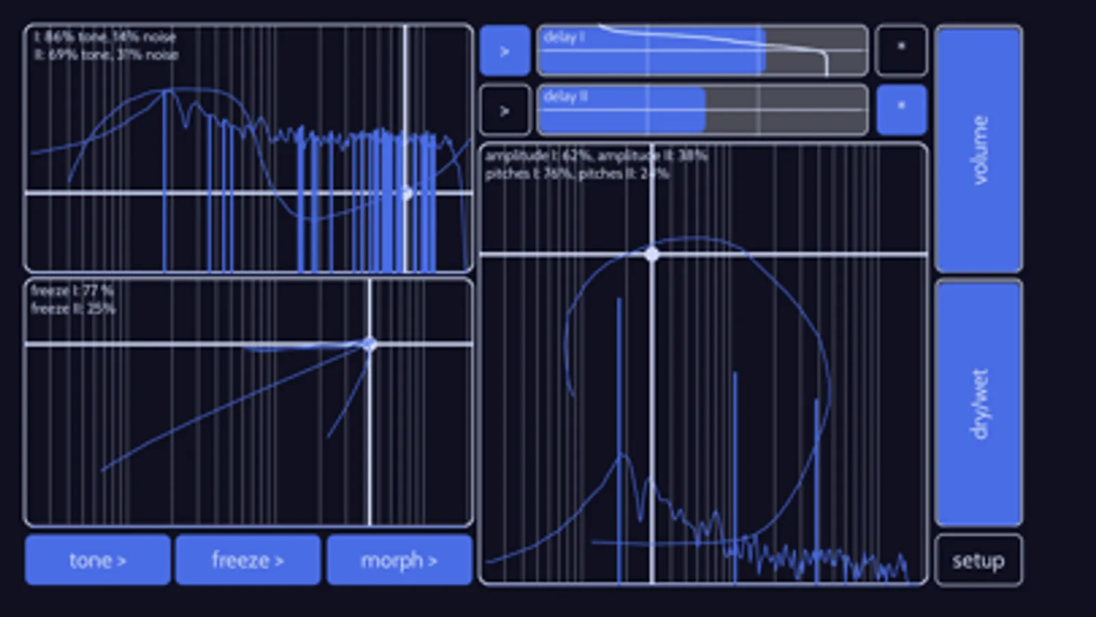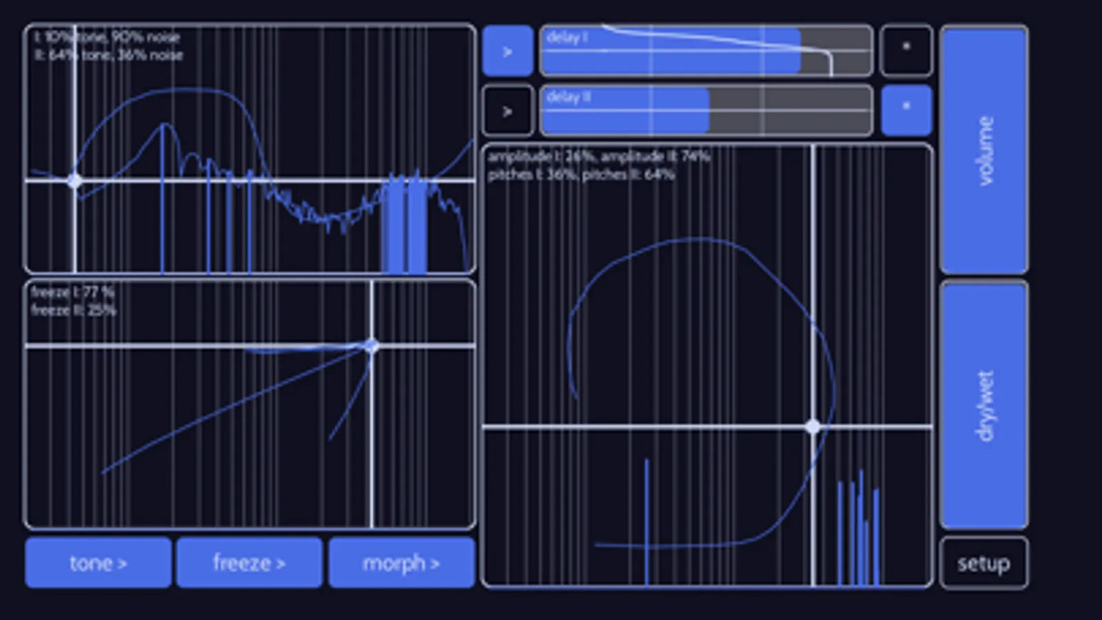 - three XY controls set balance between tone and noise components, amount of freeze and set up morphing