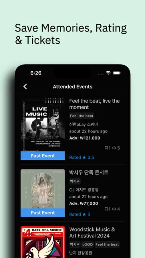 - Leave your impressions, rate performances, and upload ticket photos to cherish your concert memories.