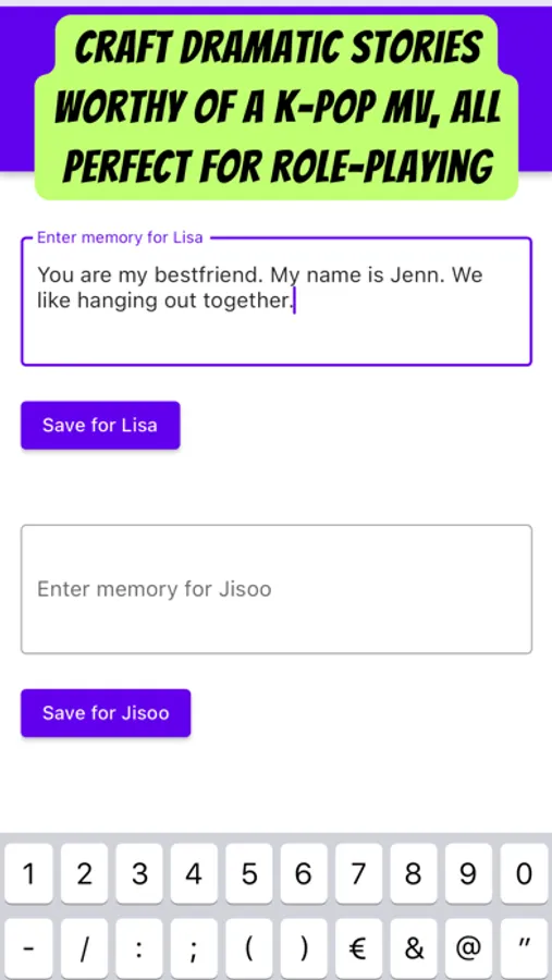 Customize the AI's memory to weave your own unique narrative. Designate any of the idols as your soulmate or concoct captivating background tales. The sky is the limit!