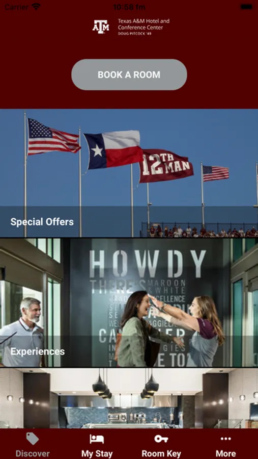 Howdy! With the Texas A&M Hotel's check-in app, we provide you with an easy way to view your booking, manage your check-in and access your hotel mobile key through your device. We look forward to welcoming you to the heart of Aggieland. Thanks and Gig 'em!