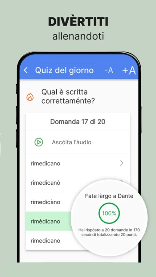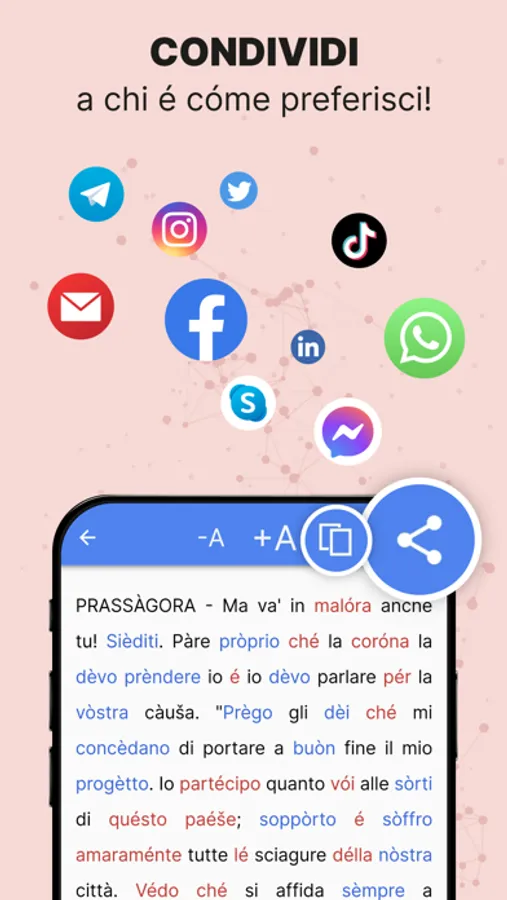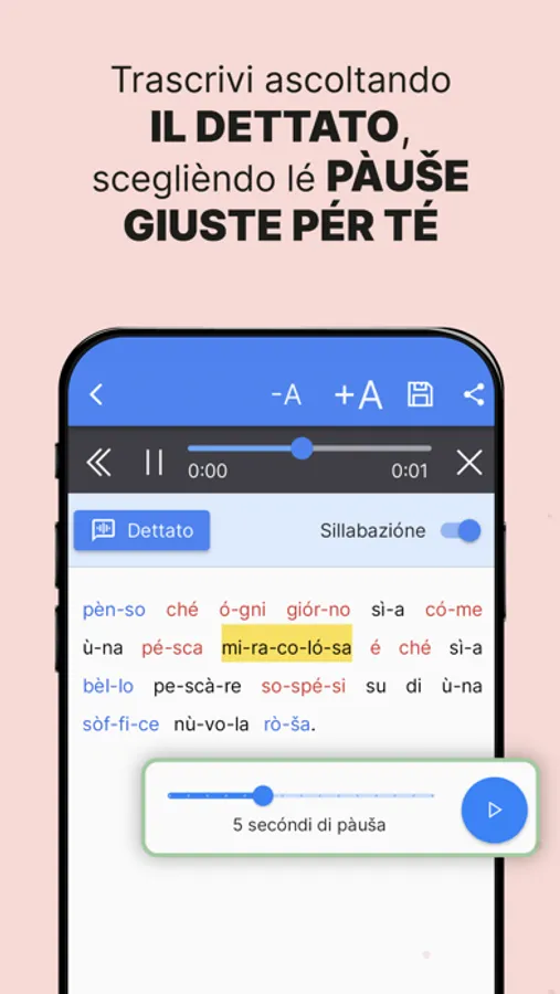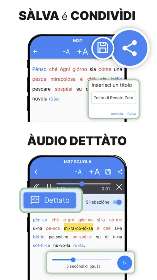 M37 accenta solo le parole con l’accento fonico, colorando le parole con gli accenti chiusi di colore rosso e quelle con accento aperto di colore blu per facilitarne la lettura e la memorizzazione. Il testo elaborato si può rimpicciolire o ingrandire (-A) (+A), può essere copiato e/o condiviso, può essere salvato per poi ritrovarlo nello spazio dedicato che si trova nella sezione “I tuoi testi”.