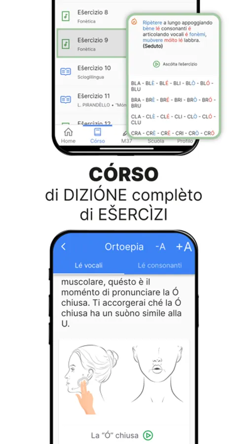 Contempla un corso base con decine di esercizi che aiutano a migliorare la pronuncia, l'uso dei suoni, la respirazione, l’epurazione di cadenze territoriali, l’articolazione dell'apparato boccale.