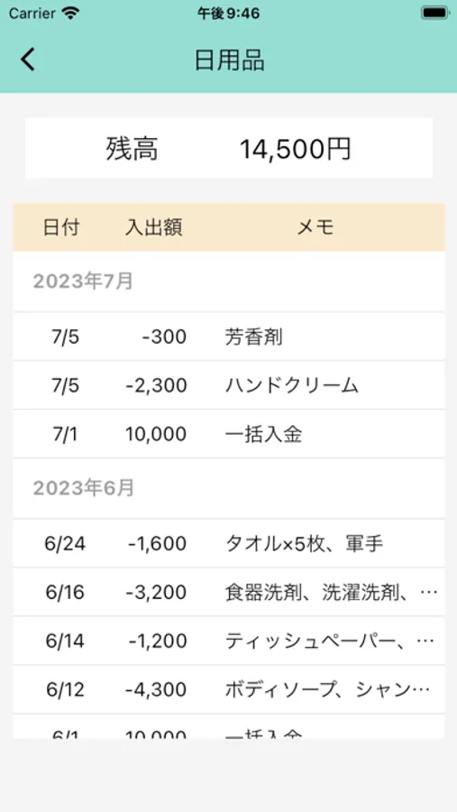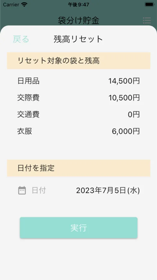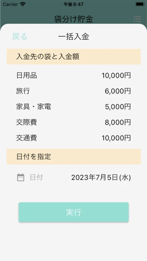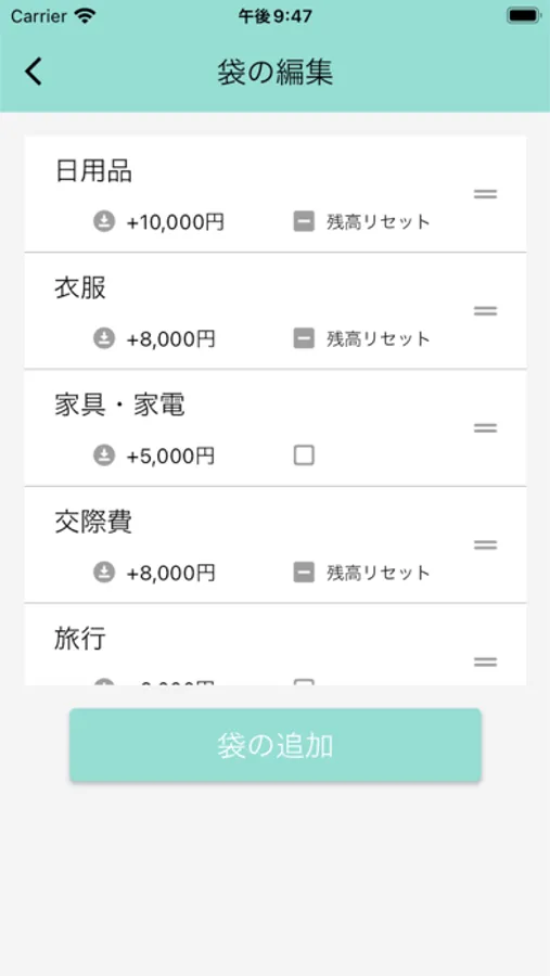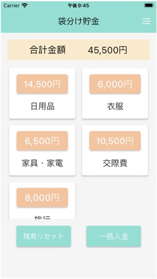 このアプリは、お金を目的別に分けて(袋分けして)管理する貯金アプリです。