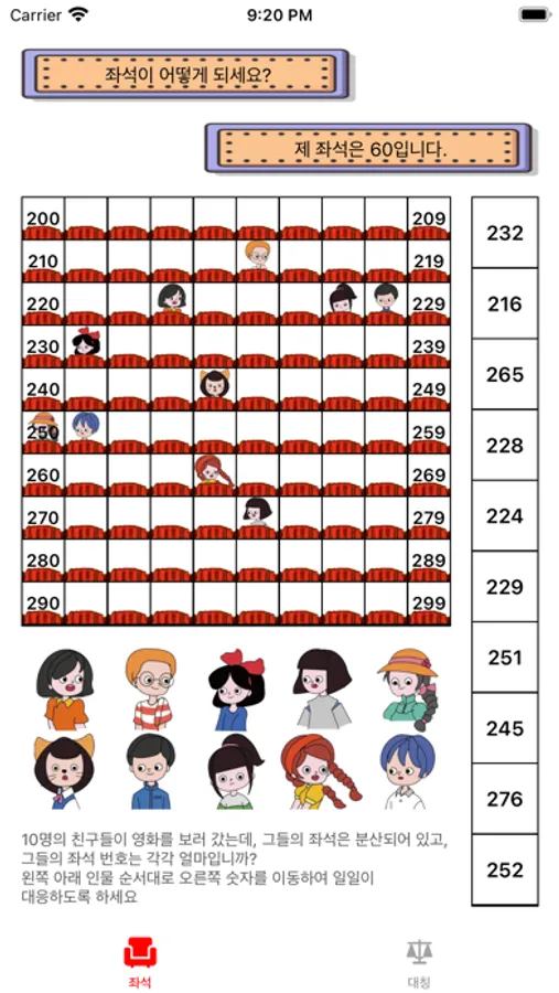 10명의 친구들이 영화를 보러 갔는데, 그들의 좌석은 분산되어 있고, 그들의 좌석 번호는 각각 얼마입니까?