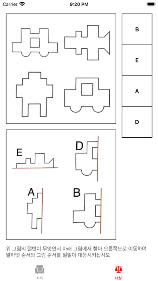 위 그림의 절반이 무엇인지 아래 그림에서 찾아 오른쪽으로 이동하여 알파벳 순서와 그림 순서를 일일이 대응시키십시오