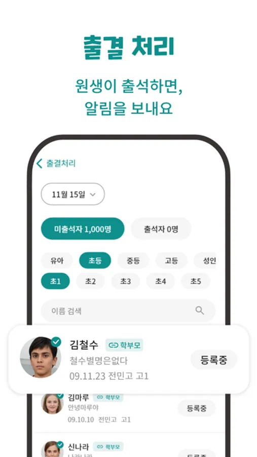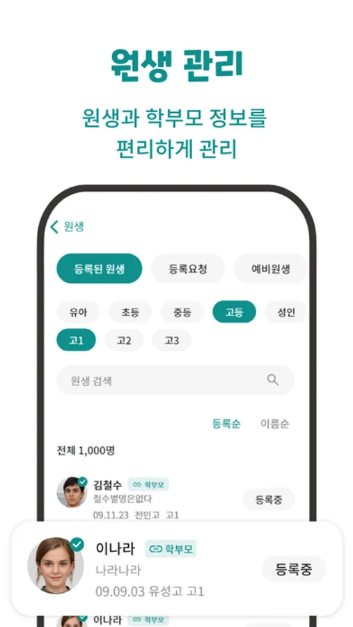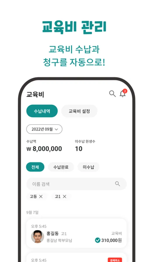 학원 운영에 필요한 알맹이만 모았습니다. 원생, 출결, 수납, 알림 등 학원 운영 기능을 쉽고 편리하게 하실 수 있습니다.