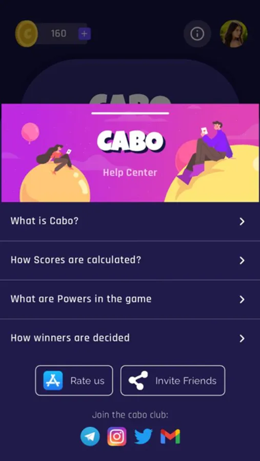 Cabo is not just a card game but also a game that will sharpen your mind and strategy skills. Also, Cabo is intended for entertainment purpose only. This game is for players over 18 years old. Cabo just simulates the game with virtual currency & does not reward any real money or prizes & is not involved in any real money gambling.
