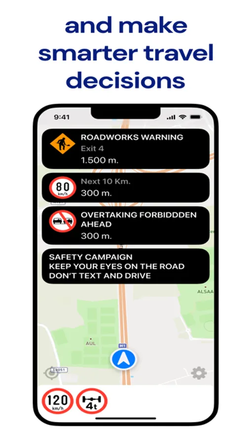 With Kapsch TrafficAssist, you'll have a comprehensive driving screen at your fingertips. It seamlessly combines a map-based display with real-time notifications and signage, ensuring you stay updated with relevant information while on the road. Our app utilizes location, travel direction, speed, and area of interest to filter and display traffic messages and events relevant for you.