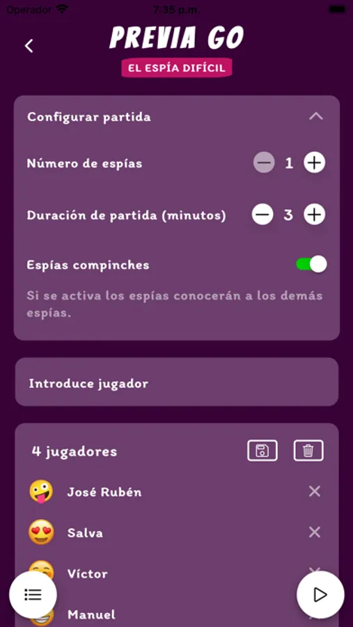 Emoción y Engaño: Sumérgete en la diversión mientras intentas adivinar la palabra correcta. Pero ¡cuidado! Algunos de vosotros está encubierto como espía y su objetivo es mezclarse y adivinar sin ser descubierto.