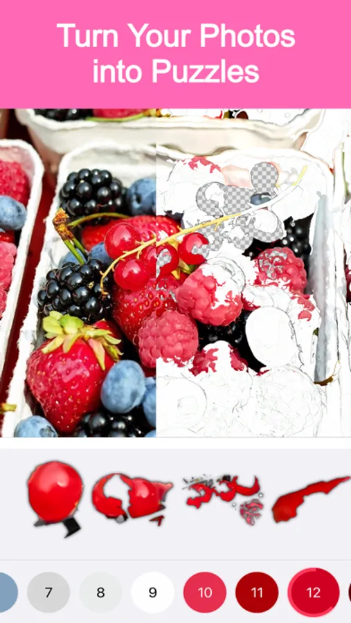 The photos and images are cut into pieces by color, and you drag them to complete the picture. The pieces are separated by color, so only about 5 to 20 pieces are displayed at a time. You can enjoy the pleasure of fitting the pieces together quickly. You might finish a 1000-piece masterpiece before you know it!