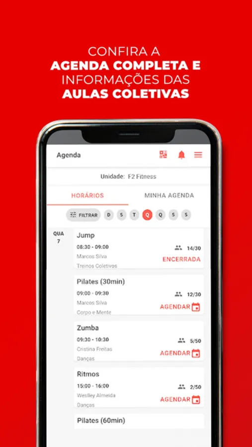 - Consulte a AGENDA de aulas: faça check-in, consulte horários, reserve lugar na sala e, se aula que você quer estiver lotada, seja notificado assim que tiver vaga disponível!