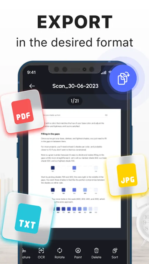 Need to convert files into different formats? Scanner has got you covered. Whether you want to convert your files to PDF, TXT, or JPG, the app offers a seamless conversion process, ensuring compatibility and flexibility with your preferred file formats.