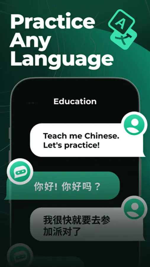 Talk on any language with AI Chat bot. Translate any text, learn and practice any language by your choice.